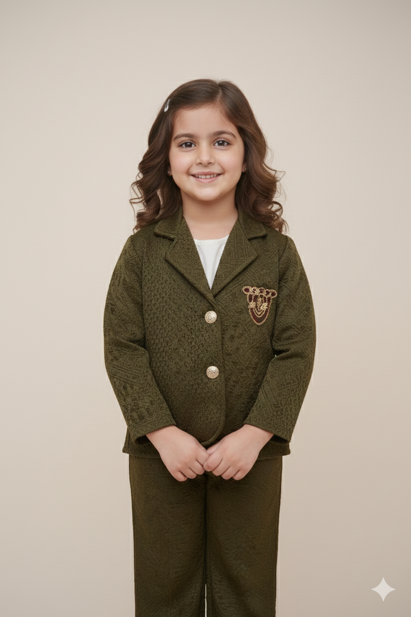 Chic Girls’ Olive Green Textured Pant Suit Set