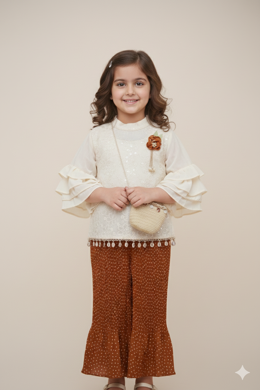 Be the first to review “Sweet Girls’ Cream Sequin Top & Brown Polka Dot Bell Bottom Pants” Cancel reply